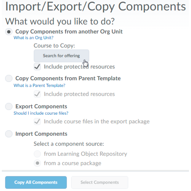 Copy all items: Copies all items for the selected components, such as all quizzes or all assignments.