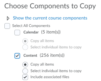 On the Select Course Material page, if you chose Select individual items to copy, click the Expand All link to view all items in the selected component.