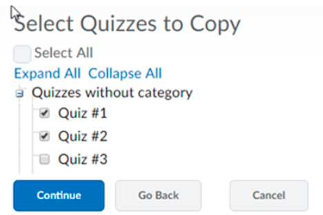 Select individual items to copy: Copies individual items, such as one quiz or two assignments.