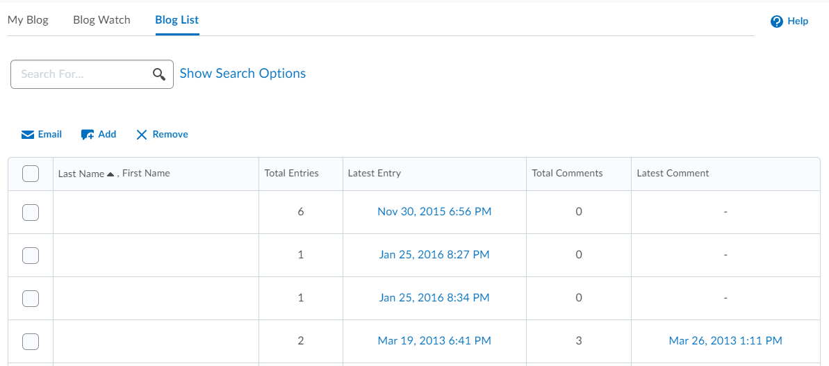 Click on a date in the Latest Comment column to view that user's public blog entry with the most recent comment.Click the Add to your Blog Watch link at the top of the blog or entry to follow the blog of the selected user. If this button is not immediately visible, click the arrow beside the user's name and then select Add to your Blog Watch.