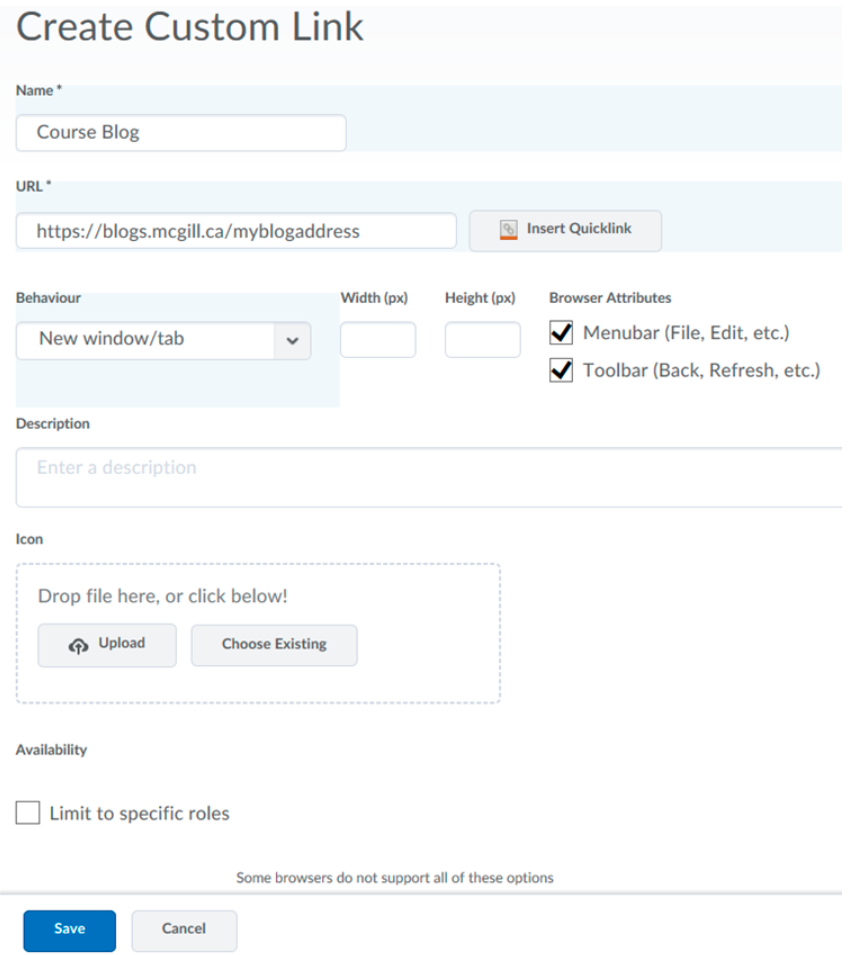 In the URL field, enter the website address of your Custom link OR click Insert quicklink to select a course object to link to.