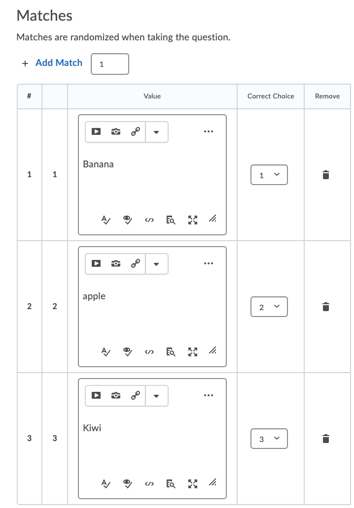 Click Add Match to add matches. These will appear to students in a column on the left.