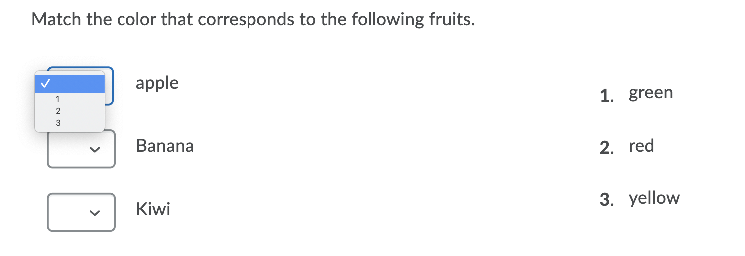 Students must select the Choice numbers from the drop-down list beside each Match on the left. The order of the Matches will be randomized for each student.