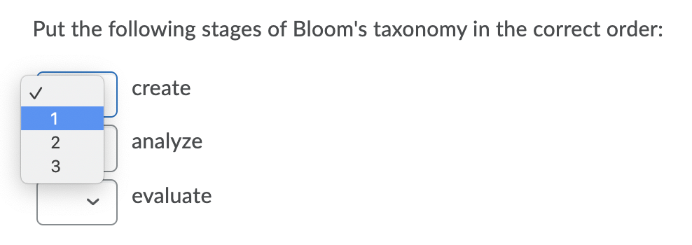 Students must select the numbers indicating the correct order from the drop-down lists on the left. The order of the items will be randomized for each student.