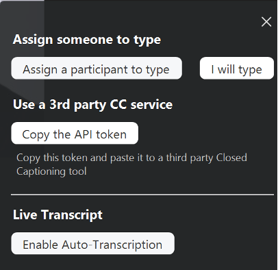 Select Live Transcript on the Zoom toolbar. An options window will appear.