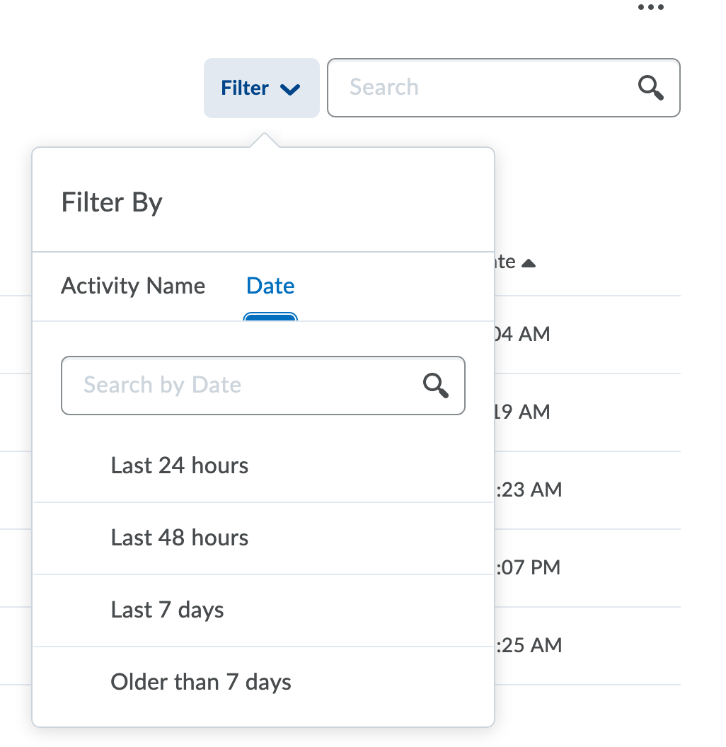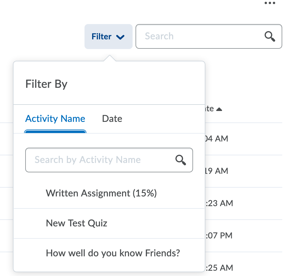 Select the Filter button in the top-right of the Submissions or Activities view. A drop-down menu will appear. You can then select one of two filters: Activity Name or Date.