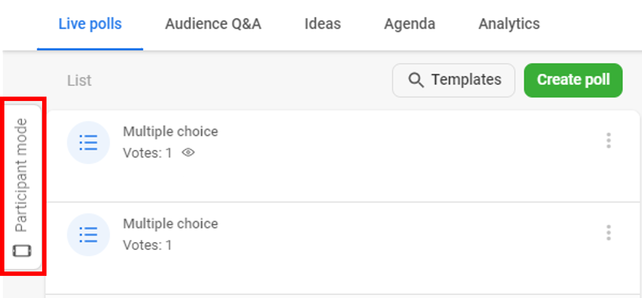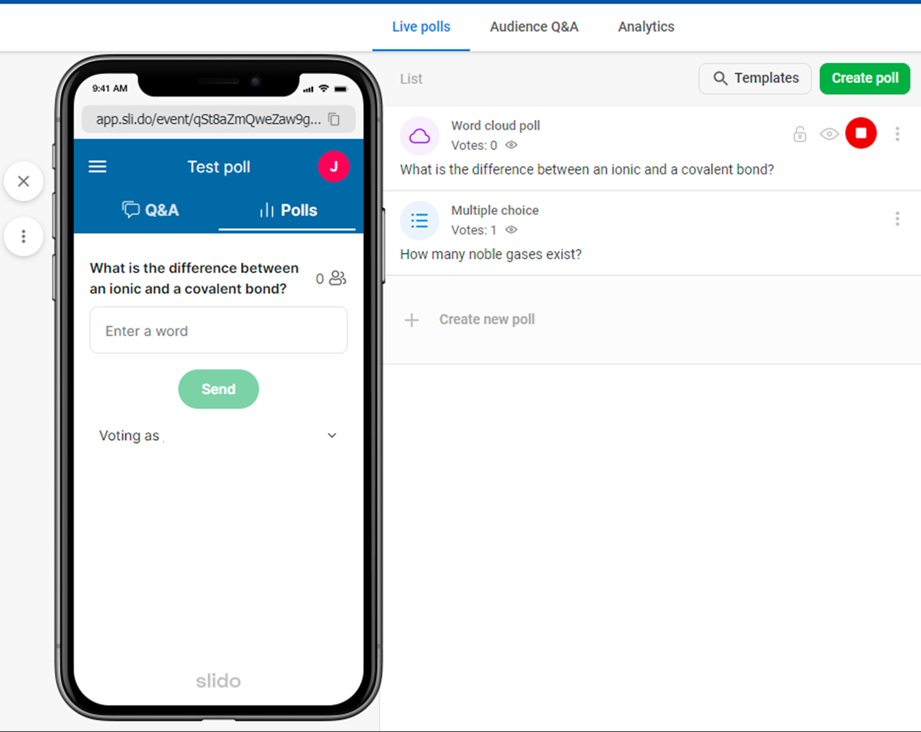 There are two ways to test your Slido polling event: use the Participant Mode (available when using Slido in an internet browser) or log in as a participant with an additional device.