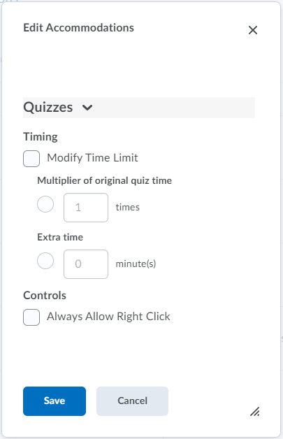 Enter appropriate accommodations for the student; you can opt to change the Timing or Controls of a quiz.
