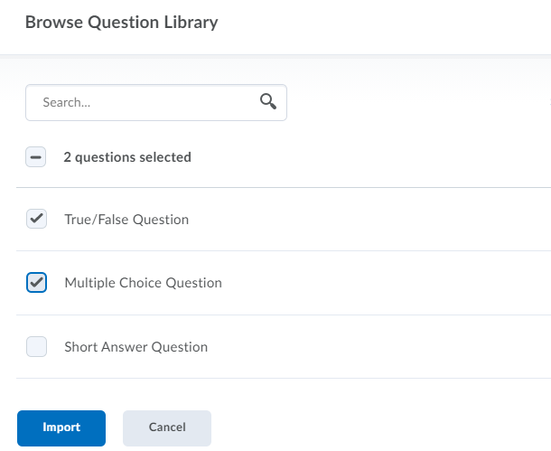 Select Browse Question Library to choose questions for the quiz. Click the checkbox beside each question that you want to add, then click Import. See Import Questions into a myCourses Quiz, Survey or Self Assessment for more information.