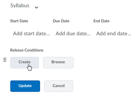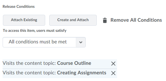Release conditions can be used to restrict students' access to content until specific conditions are met. For example, you can grant access to course materials only after you give a certain lecture, after students read the course outline, or after students submit a specific assignment. You can also create release conditions that: