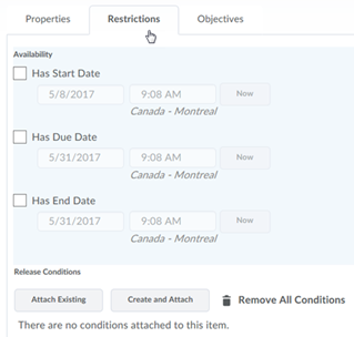 When you edit an activity such as a quiz or assignment, release conditions can be set in the Restrictions tab in the Release conditions section. Select Create and attach to create a new condition or Attach existing to link an existing condition.