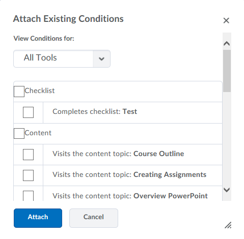 In the pop-up window that appears, select the checkbox beside each condition you wish to attach.