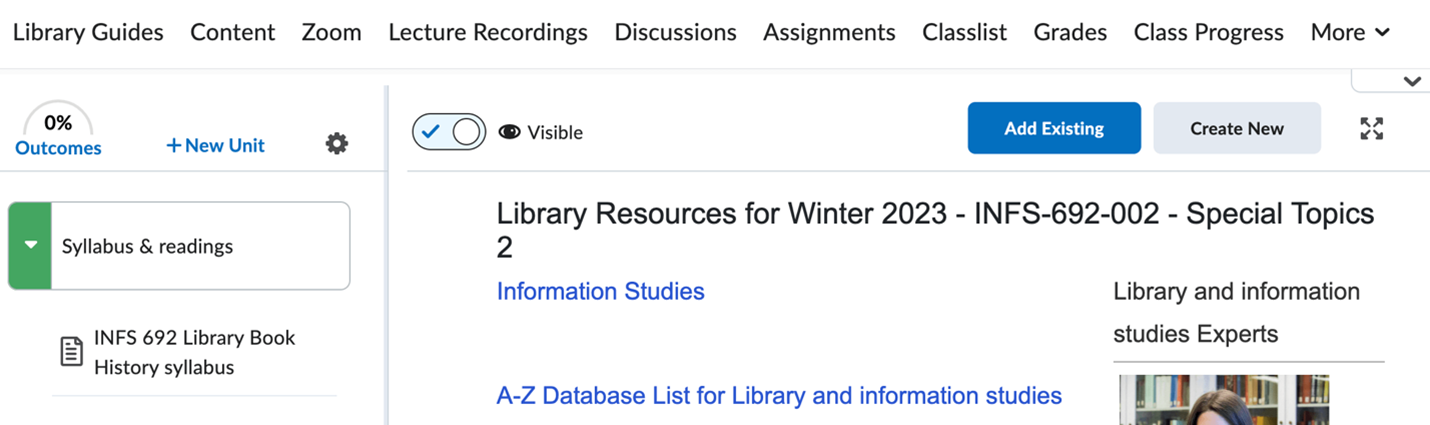 Library Guides is available upon request. To enable this tool in your course submit a request to add an external learning tool.