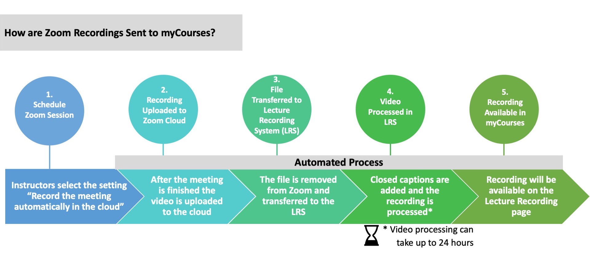 The following infographic illustrates how recordings are transferred from a Zoom session to the Lecture Recordings page in myCourses.