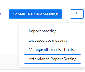 In the Zoom tab of your course, click on the three-dot button on the top-right corner of the window and select Attendance Report Setting.