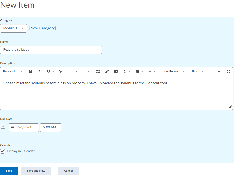 (Optional) Enter a Description, select a Due Date and choose whether to Display it in the Calendar.