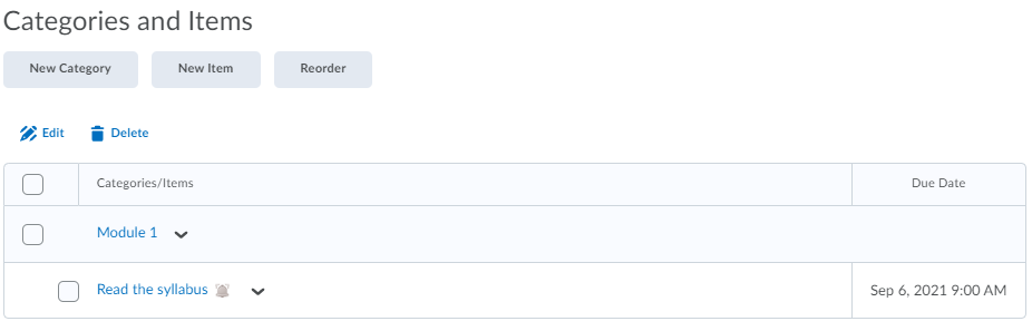 Select the checkbox at the top of the list of categories and items and click Edit to edit all items' Name, Category, Due Date, and Calendar display.
