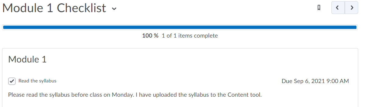 You can use the Checklists tool to present students with a list of tasks that they can check off. You can set due dates for each checklist item and use the class progress page to track students' completion of your checklists. You can also set release conditions based on checklist items to have certain material appear to students after they click a checkbox.