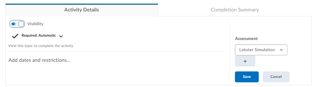 Select a Labster simulation from your Content tool. Under Activity Details, choose an existing grade item from the Assessment drop-down menu or create a new one ( + ). Click Save.