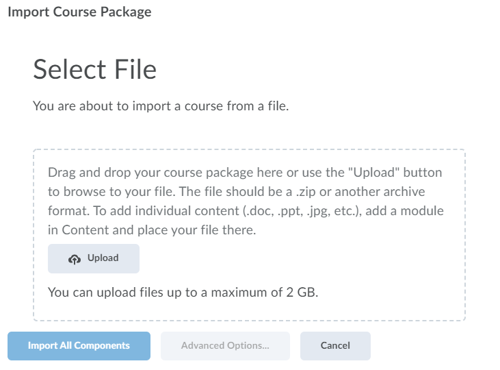 Click Download. On the following page, select Brightspace/D2L under Download a Common Cartridge File. This will provide a .zip file that you can upload to myCourses.