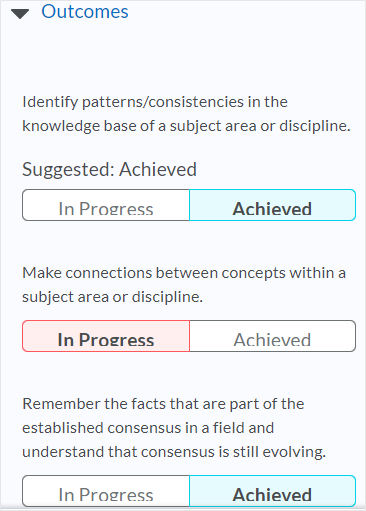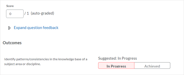 If you attach a rubric with aligned learning outcomes to an assignment, those outcomes will also be visible under the Outcomes collapsible menu. As you assess an assignment with the attached rubric, these outcomes will display suggested achievement levels (Achieved or In Progress), depending on how achievement levels were mapped to percentage scores or rubric levels (see above).