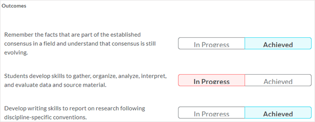 You can use an achievement scale to assess the learning outcomes aligned with course materials and activities. This achievement scale is decided on an institutional level. McGill courses have two achievement options: Achieved and In Progress.