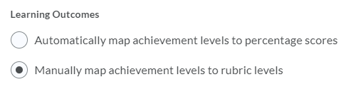 Choose Manually map achievement levels to rubric levels to create a higher or lower standard. For example, students must receive 100% on that rubric criterion before a learning outcome is Achieved.