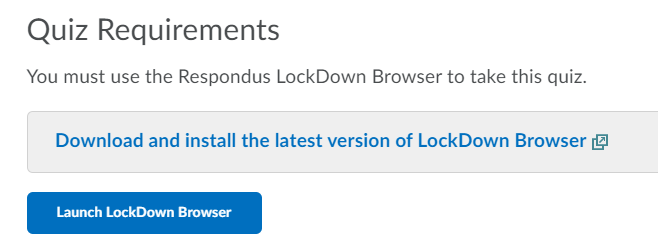 Students navigate to the Quizzes tool in myCourses and select a specific quiz, they then click Launch Respondus Lockdown Browser. Students must download and install the latest version of LockDown Browser to begin the assessment. They will use the LockDown Browser to view and answer questions online.
