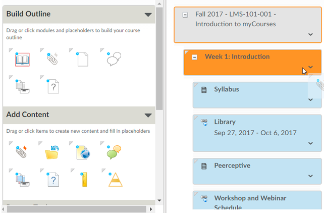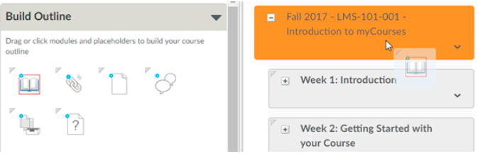 Build outline: Drag and drop an icon from this section to create a new Module or a Placeholder for a future file, link, discussion, assignment, or quiz. These Placeholders must be housed within a Module.