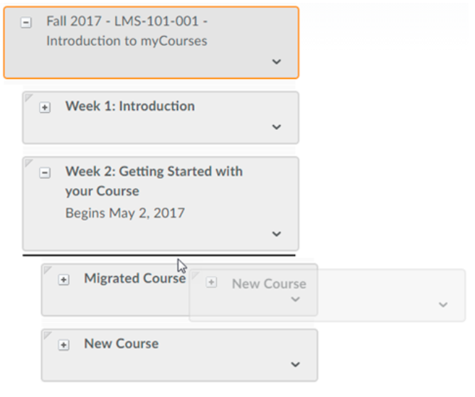 Drag and drop items in the Course Builder canvas to the desired position. A black line appears in the position where the item will be moved.