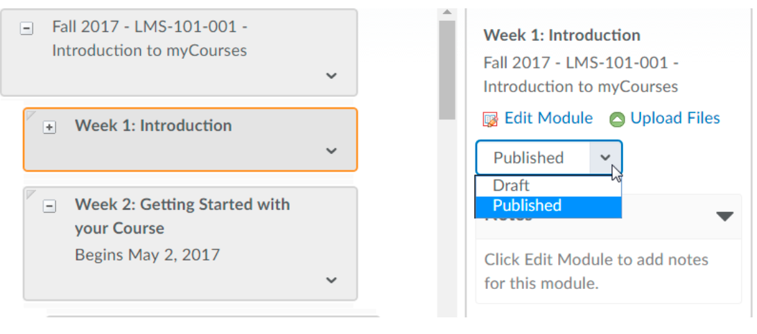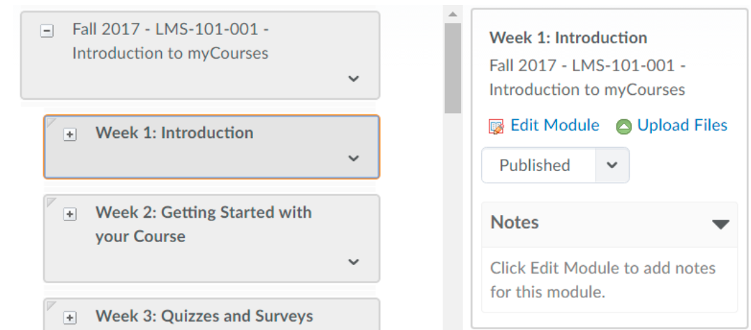 Selected module panel: The box on the right side of the page will show information and options for any module or item you select in the Course Builder canvas. Depending on the object you select, this panel also lets you hide, edit and upload files to a module.