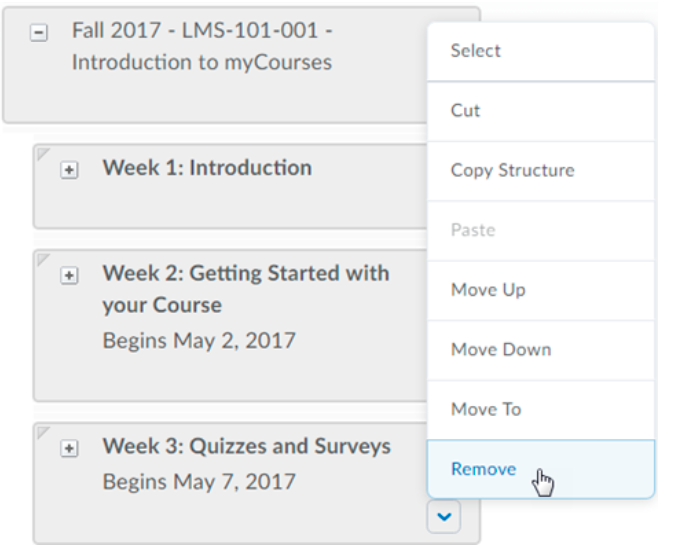 Course Builder canvas: Your content will appear in a list of modules in the middle of the Course Builder page. You can drag and drop these modules to easily reorder your content. Click the plus or minus sign on each moduleto expand or collapse the sub-modules and items inside. You can also click the arrow beside each module to manage and delete content.