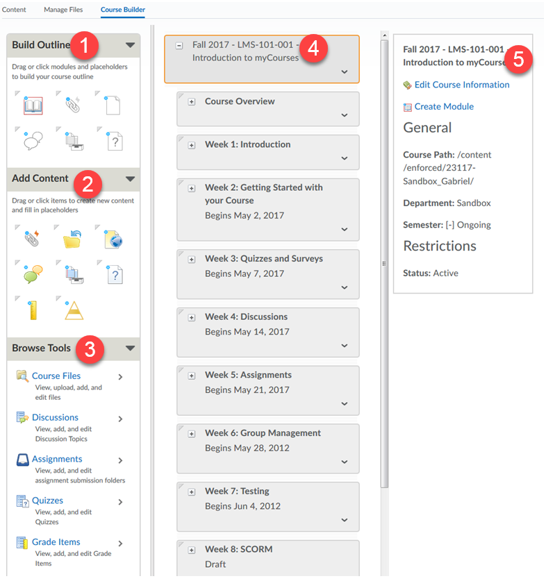 The Course Builder tool allows instructors an alternative interface for adding and managing course content, including course materials, assignments, grades, and learning objectives. You may prefer to use the Course Builder in lieu of the Content tool if you want to organize your myCourses page in one central location and using a drag and drop interface.