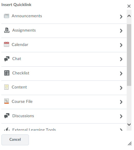 link to existing content within your course by clicking the Quicklink icon beside the URL field. Select an activity and click Insert.