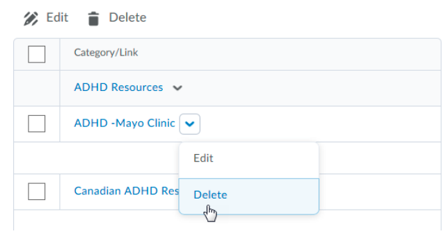 Select the Delete icon at the top or bottom of the Category/Link list.