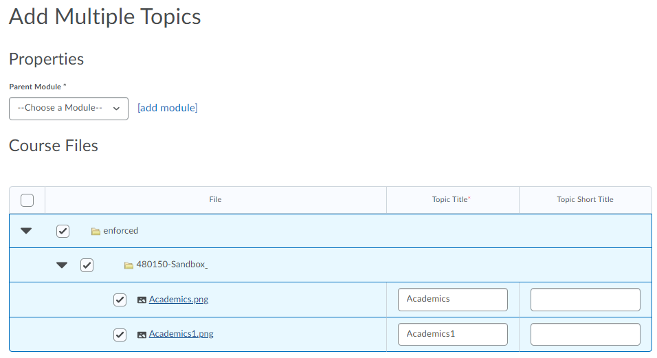 Select an existing Parent Module from the drop-down menu at the top of the page or click [add module] to create a new one.