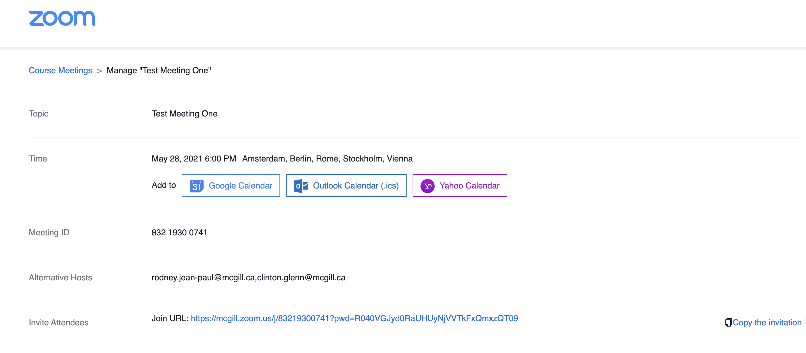 A Join URL link will be created once you have created your session. Either copy the link manually and share it with your students by email or select Copy the Invitation. Copy the Invitation will open up a window where you can copy the full invitation to send via e-mail.