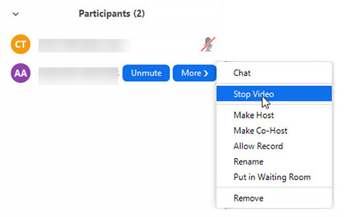 Turn off a student's video | Host or co-host only | Select Manage Participants. Find the student you want to manage and select More, and then Stop Video. ![]() |