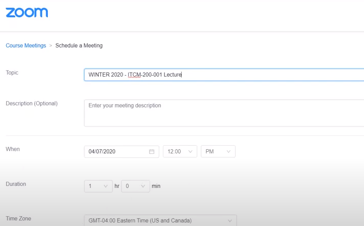 Topic: Enter a topic or name for your session. In order for a recording to be pulled automatically into myCourses, the session name must be the full course name as it appears in myCourses (e.g., Winter 2020 - ACCT-362-003 - Cost Accounting – March 23 lecture). | Require meeting password: OFF Enable join before host: OFF Mute participants on entry: ON – This will mute students as they join the session. Students can unmute themselves after joining the session. Use Personal Meeting ID: OFF Enable waiting room: OFF Only authenticated users can join: ON/OFF (Option to restrict to McGill users) Record the meeting automatically: ON/OFF – Select ON if you want the session to be automatically recorded and select In the Cloud for the session to be uploaded to the Lecture Recording System for students. You may wish to turn the Record the meeting automatically option OFF and only enable recordings when you start the session. |
