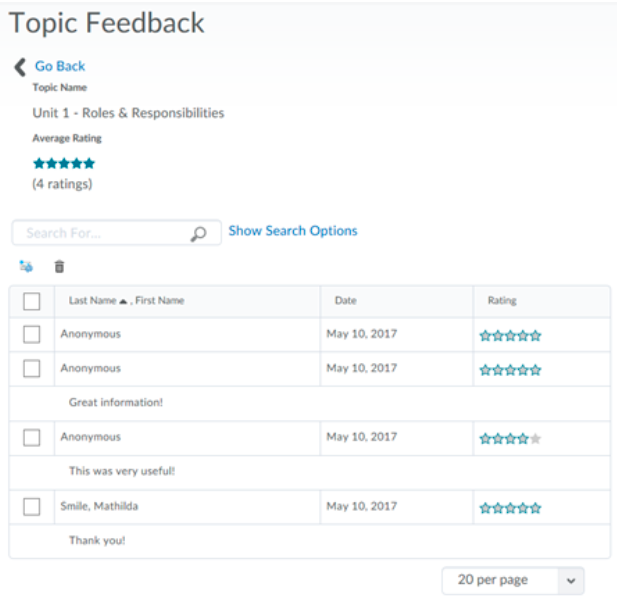 Clicking on a number in the Ratings column allows you to view the individual ratings and comments for that Item.