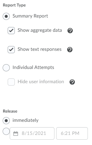 immediately: select this option to allow users to view the report at any time. This is not recommended if you are releasing a report to students because they will be able to view the report before they have completed the survey (e.g. after the survey closes).
